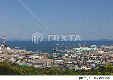 四国中央市川之江地区の町並みと燧灘に浮かぶいりこの島伊吹島