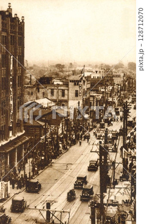 古写真 1933年 東京 新宿駅東口から望む新宿通り沿いの三越と伊勢丹