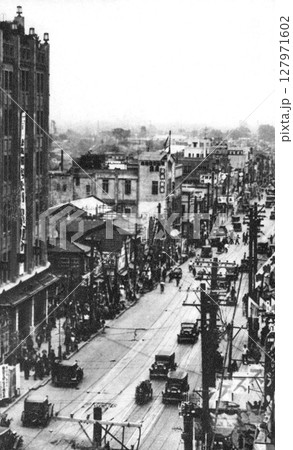 古写真 1932年 東京 新宿三丁目 明治通りの伊勢丹前