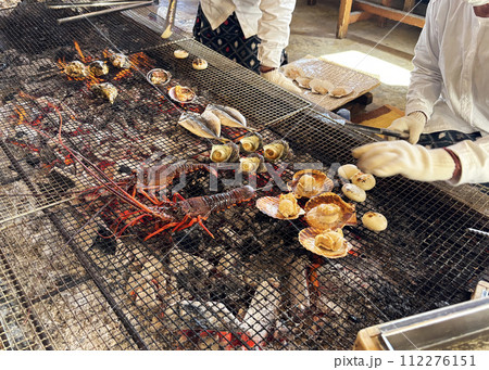 伊勢海老、牡蠣、サザエ、魚の炭火焼き 三重県日本