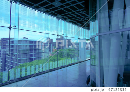 緑の木々に囲まれたガラス張りのビルの都市風景