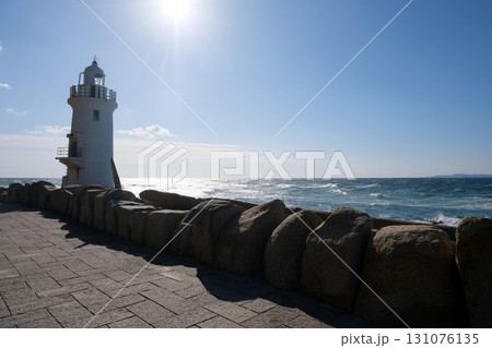 伊良湖岬灯台と三河湾の青い海 快晴の太平洋に立つ白い灯台