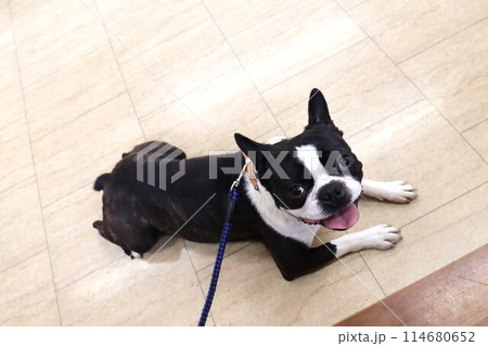 動物病院の待合室で順番を待つボストンテリアのマイティ君♡