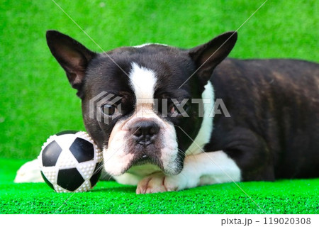 緑色の人工芝の前でサッカーボールと並んで可愛く見つめるボストンテリアのマイティ君♡