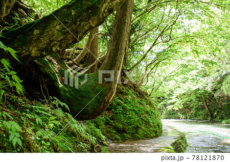 木漏れ日に映える伏伸の滝新緑 秋田県