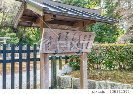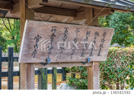 後嵯峨天皇火葬塚、龜山天皇火葬塚、後伏見天皇火葬塚の宮内庁の木の案内看板、京都、嵯峨野、嵐山