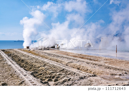 噴煙の上がる山川製塩工場跡