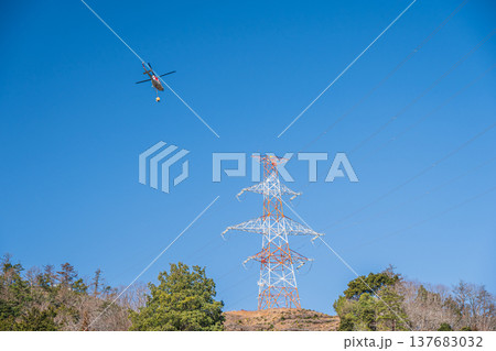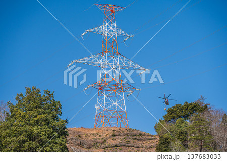山の上に立つ送電線鉄塔 滋賀県長浜市近江塩津
