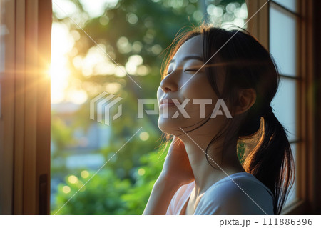 森の中でリフレッシュする日本人女性(森林浴・リラクゼーション)