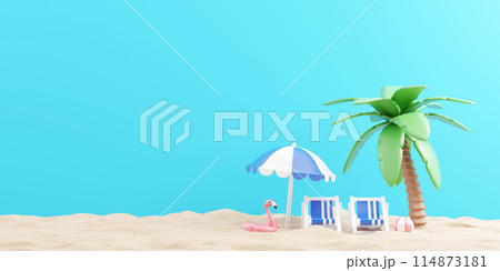 Summer tropical banner concept design 0f beach chair and umbrella flamingo inflatable with coconut tree on the beach 3D render