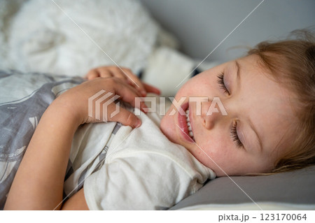 Cute little girl sleeping and grinding teeth in dreams, clenched teeth with tiredness and stress