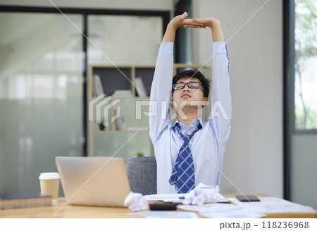 Young man stretching and leaning back to relax after long hours of work at his desk