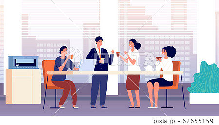 Office coffee break. Business lunch, managers in cafeteria or kitchen room. Friends meeting, people drinking and talking vector illustration