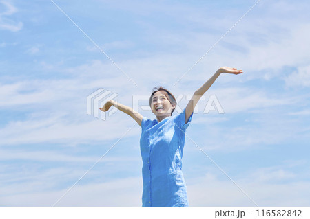 屋外で伸びをする女性