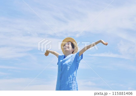 外で伸びをする女性 後ろ姿
