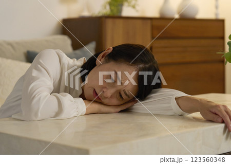 疲れている50代の女性 夜のリビング