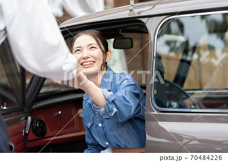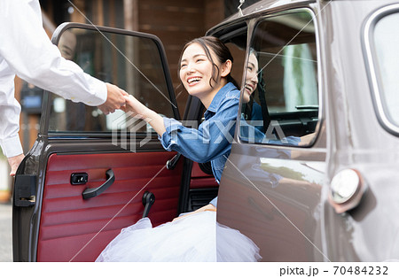 男性のエスコートで車を降りる女性