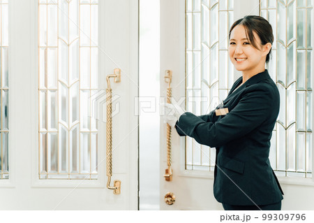 結婚式場のドアを開けるウェディングプランナー・ドアスタッフ・ホテリエの女性(結婚式スタッフ)