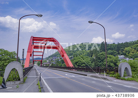 只見川の特徴的な赤い橋梁と青空のコントラスト自然の緑が美しい