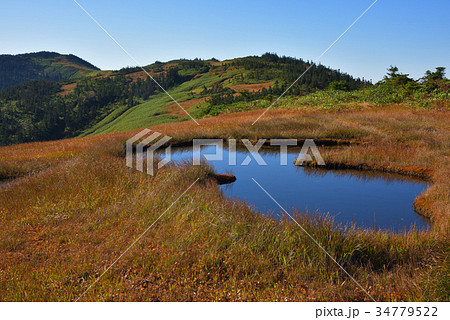 池塘と草紅葉 秋の会津駒ケ岳から中門岳への尾根
