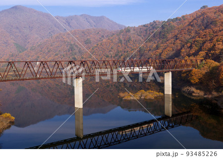 紅葉の山と五十里湖と会津鬼怒川線の湯西川橋梁と列車