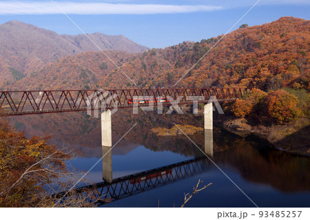 紅葉の山と五十里湖と会津鬼怒川線の湯西川橋梁と電車
