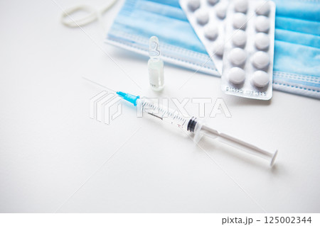 Preparation for vaccination against covid-19. Syringe, vaccine, pills, medical mask.