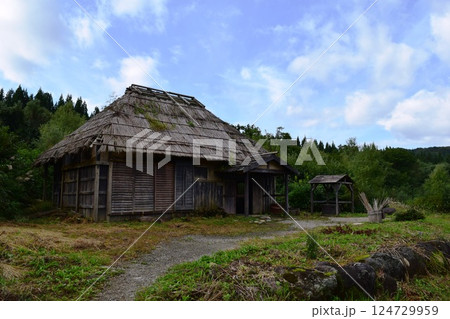 茅葺き屋根の古民家越しの秋の早朝の富士山