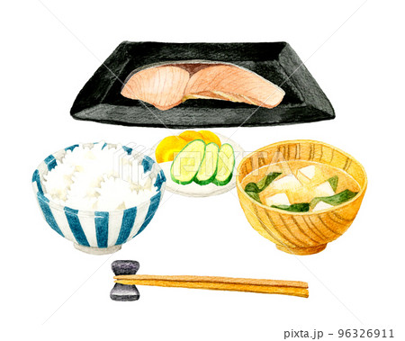 日本の朝食セット(ご飯、味噌汁、漬け物、焼き魚) 和食の手描き水彩イラスト素材