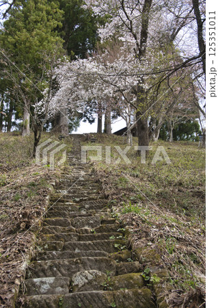 桜咲く伝行山稲荷神社の参道の石段 長野県白馬村