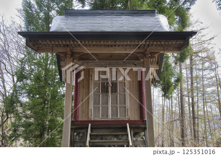 桜咲く伝行山稲荷神社の鳥居と参道の石段 長野県白馬村