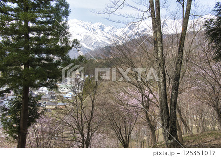伝行山展望公園の桜と残雪の白馬連峰 長野県白馬村