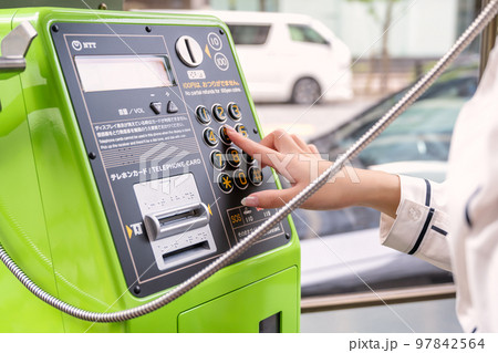 携帯電話の通信障害で公衆電話を使う若い女性のイメージカット