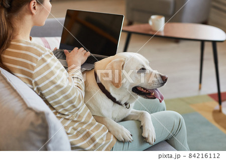 Happy smiling woman sitting at table with her dog and looking in laptop screen. Female freelancer working from home office at night with pet.