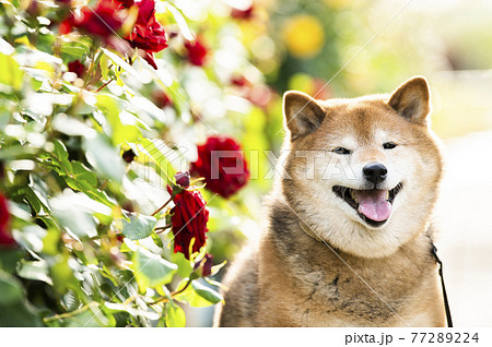柴犬 ポートレート バラ園 目つむり