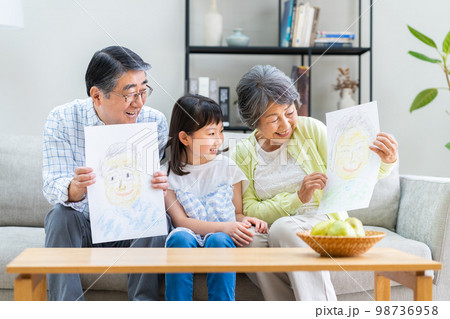 敬老の日 孫から似顔絵をもらう祖父母