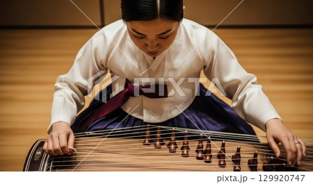 Korean Traditional Musician Playing Gayageum in Hanbok Dress