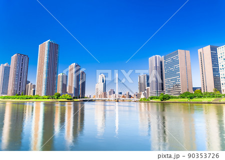 日本の都市風景 築地大橋から明石町、月島方面高層ビル群