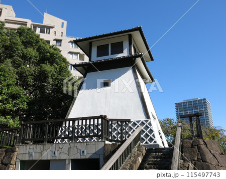 佃公園の歴史的建物と後ろに見える近代的な高層マンション