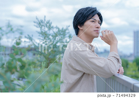 曇り空 ビルの屋上で電子タバコをすいながらほほえむ若い男性