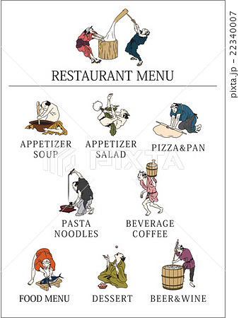 美味しそうに食べる江戸時代の浮世絵を使った居酒屋メニュー