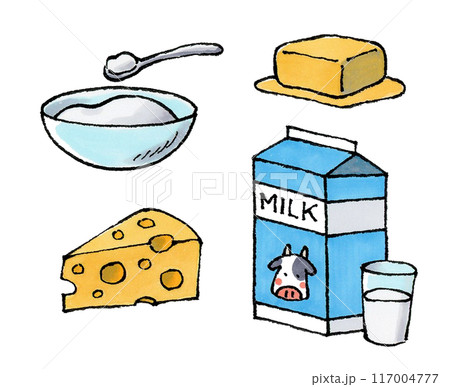 24種類の乳類・卵製品を並べた主線なしイラスト