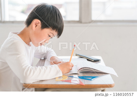 学校・塾・学童の教室で算数のドリルで勉強する小学生の男の子