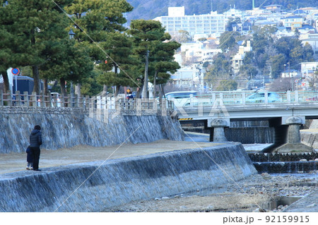 日本の街中を流れる川の風景 兵庫県芦屋市芦屋川の松並木
