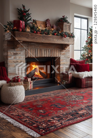 Cozy living room with lit fireplace and red carpet. Home is decorated with Christmas decorations, including tree and mantle with few candles