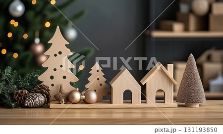 Wooden Christmas trees, houses, and ornaments on a wooden table with blurred festive background, Concept of sustainable holiday decor and craftwork, eco friendly, sustainable, zero waste