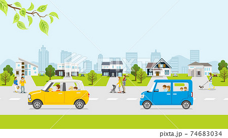 春の住宅街 新緑 車、人物つき