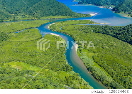 奄美大島 マングローブ原生林 - 鮮やかな真夏の木々と川の色の空撮