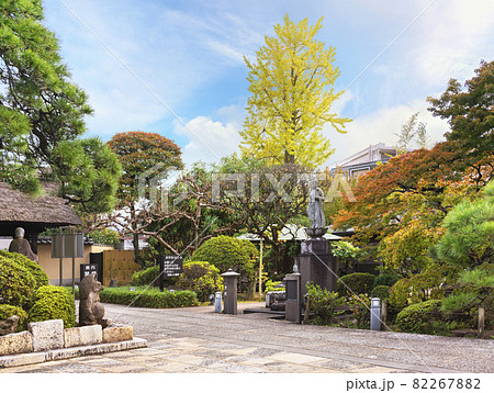 [東京・堀切] 多聞寺の中庭の紅葉と弘法大師に捧げられた平和観音像。