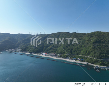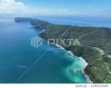 愛媛県伊方町の青い海と佐田岬半島に並ぶ風車の風景